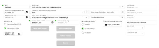 A Mentés és Rekord frissítése gombokra kattintás után a rekordot be lehet zárni. A Rekord frissítése gombra kattintva a Fizetési vállalás vége dátum beíródik az Ellátott adatai lapra.