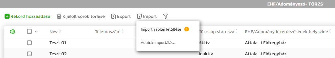 Megjegyzés: "Az EHF/Adomány lekérdezésének helyszíne" adatsor akkor fog megjelenni, ha előbb feltöltöttük az EHF/Adomány bef. helyszíne TÖRZS adatbázist!