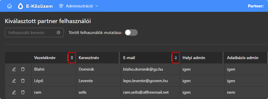 A partnerhez rendelt felhasználók a lista első oszlopában található ikonok segítségével kezelhetők.