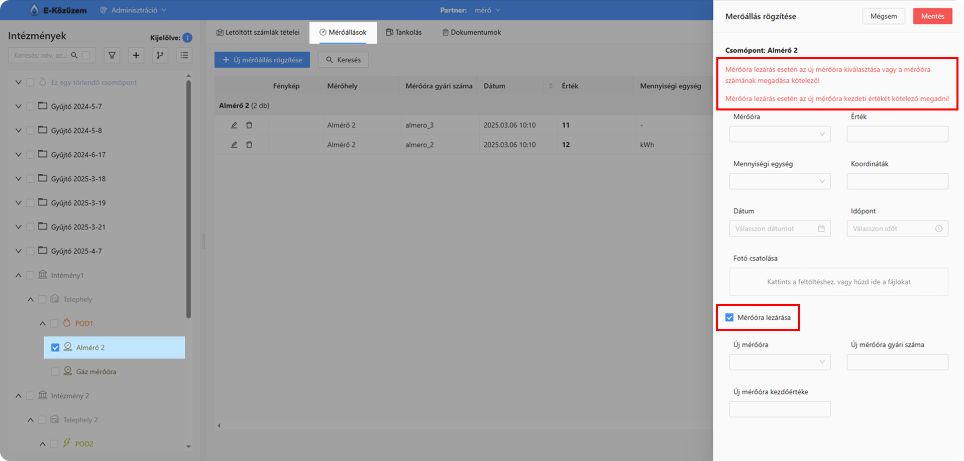 Fontos! A csomóponton megadható „Aktív mérőóra” checkbox kiürítése és a mérőóra lezárása opció nem egyenértékű. Míg az „Aktív mérőóra” checkbox azt befolyásolja, hogy a mérőórára rögzíthető-e mérési adat mobil alkalmazásból és hogy mérőórára importálható-e adat, addig a „Mérőóra lezárása” opció véglegesen zárja a mérőórát.