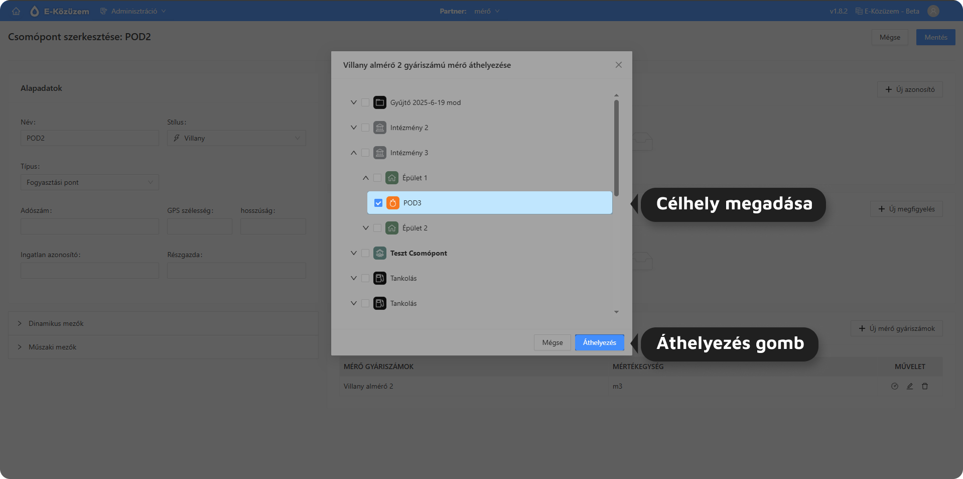Ezt követően megjelenik a Fastruktúra egy felugró ablakban, ahol a célhelyet kiválasztva, majd az áthelyezésre kattintva megtörténik a mérőóra áthelyezése.