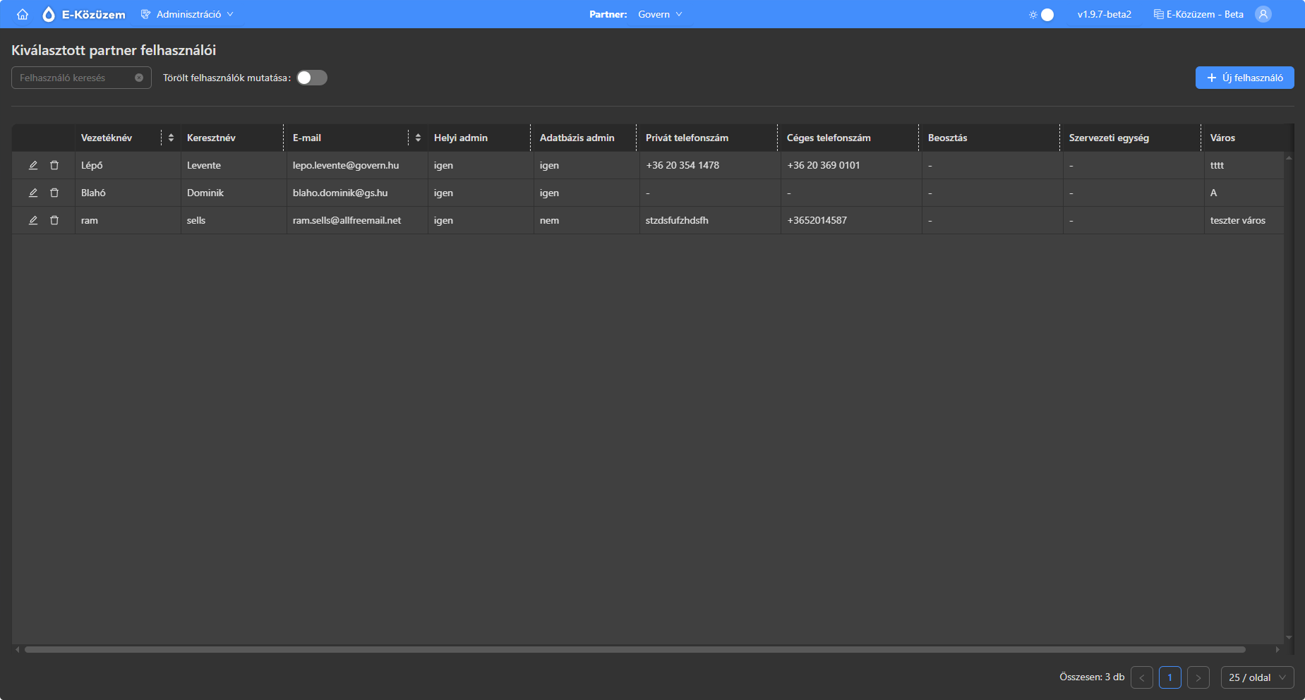Felületen felhasználók adhatók partnerhez, már léterhozott felhasználók adatai módosíthatók, törölhetők.