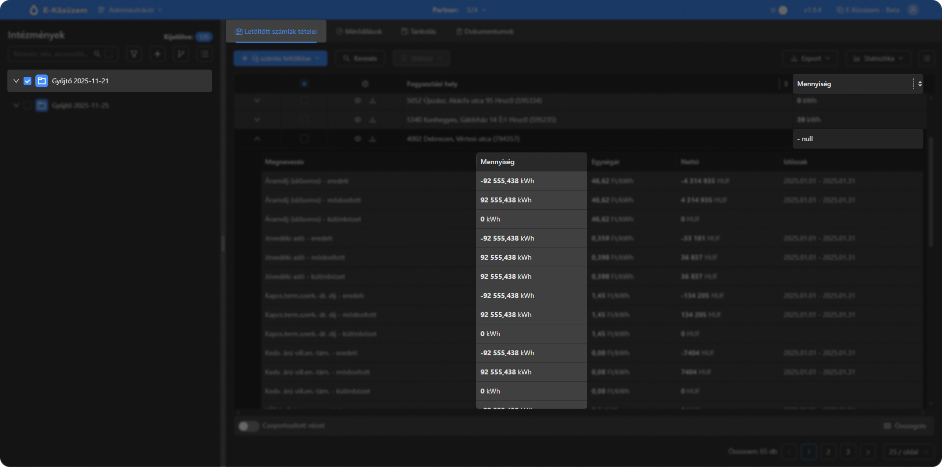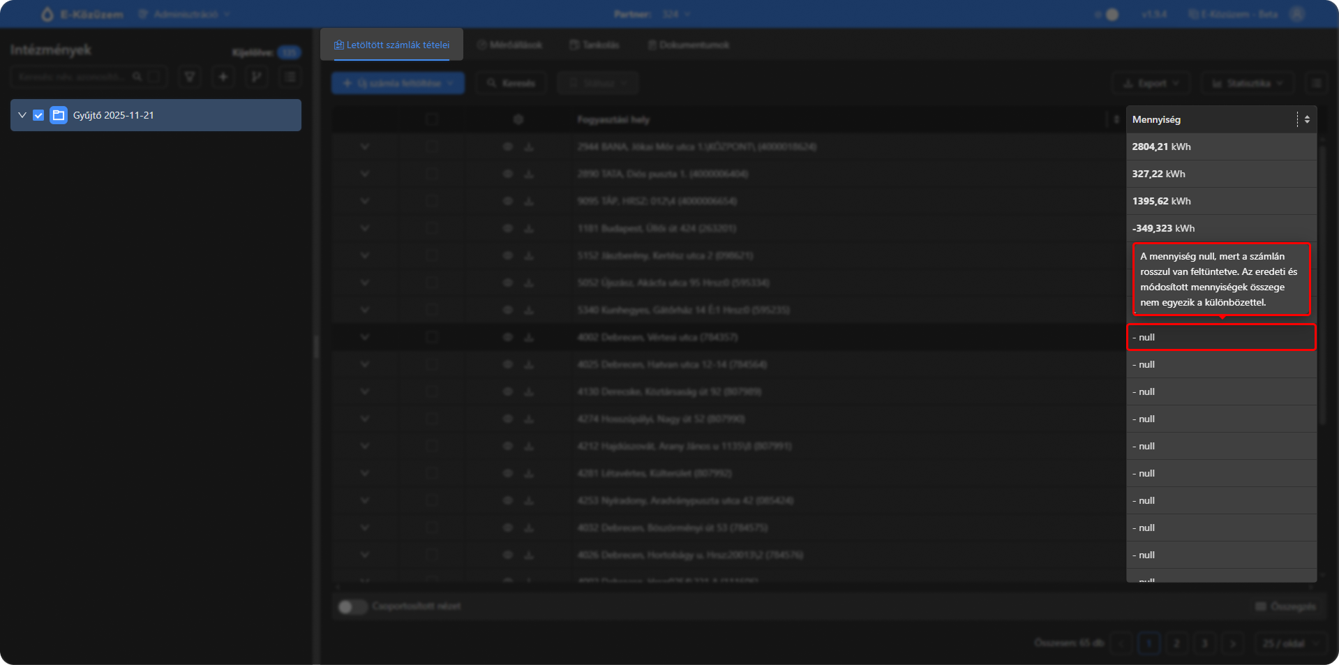 Egyes módosító/elszámoló/sztornó számlákon a mennyiség rosszul van feltüntetve. Ebben az esetben a mennyiség nincs leszedve a számláról, a "Mennyiség" oszlopba null érték kerül. Táblázt Mennyiség" oszlopának null értékére mozgatva az egeret, megjelenik a tájékoztató információ.