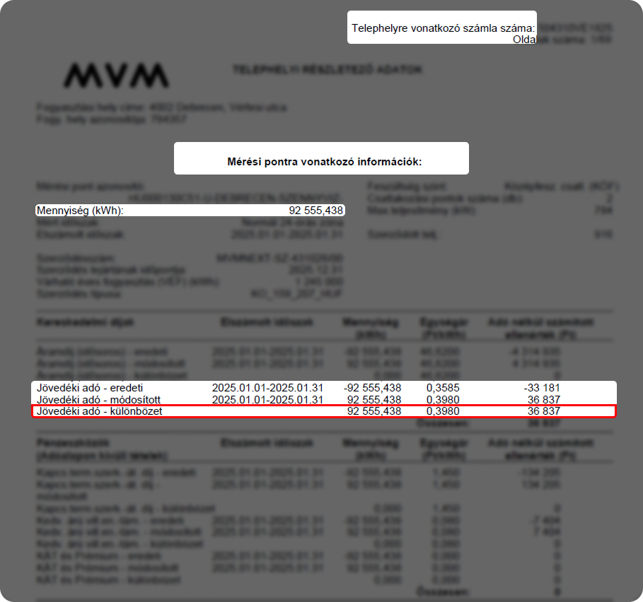 Látható, hogy a méré pontra vonatkozó fogyasztás mennyisége 92555,438 kWh. A tételek alatt az eredeti fogyasztott mennyiséget és a módosítottat összedava nem jön ki a különbözet.