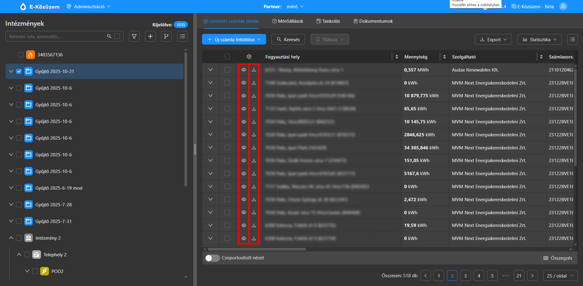 A pdf nézegető és a számlaletöltő funkciók külön lelttek szedve a "Letöltött számlák tételei" felületen. Nézegető a szem ikonnal (kepnezegeto ikon.png), míg a letöltés a letöltés ikonra (pdf_letolto_ikonú.png) kattintva indítható.