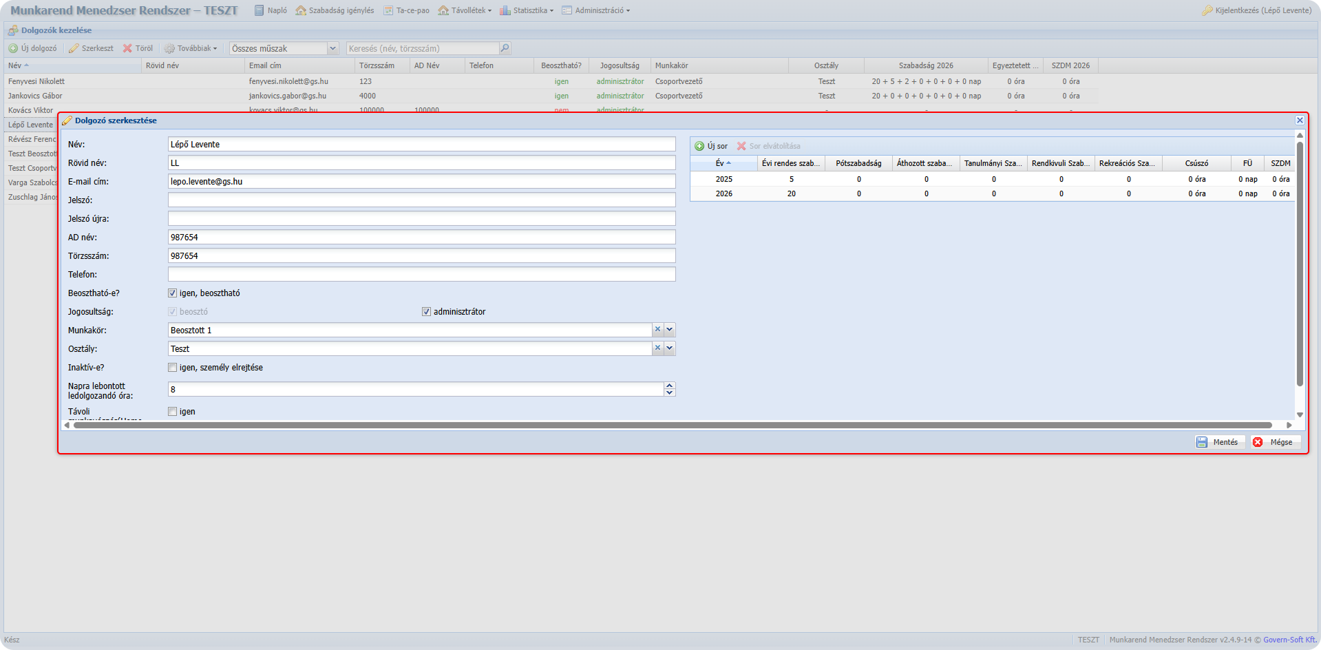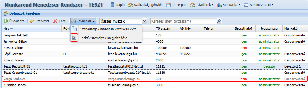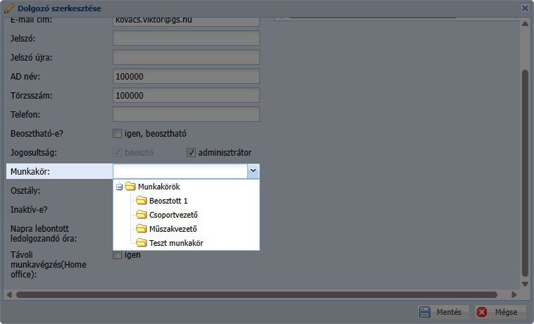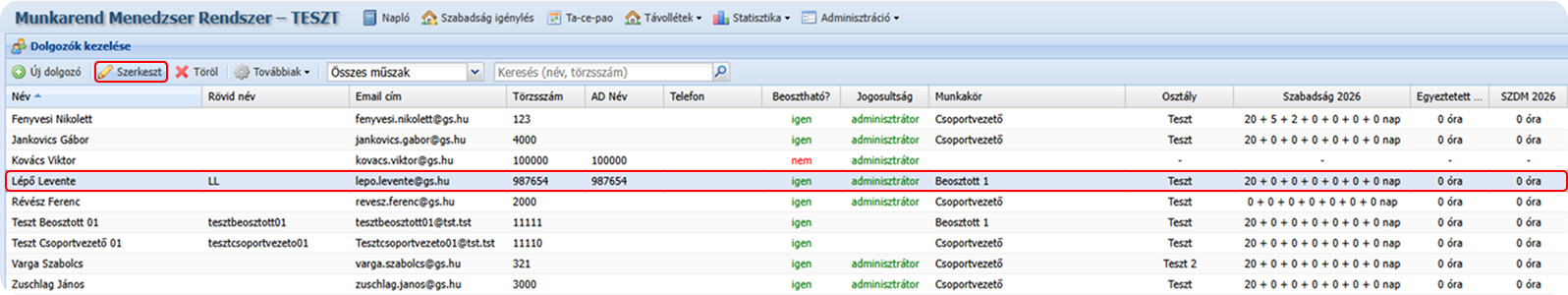 Adminisztráció → Dolgozók kezelése