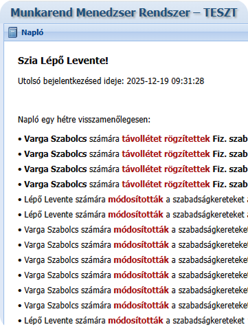 A felületen a naplózott események listája látható. Az események egy hétre visszamenőleg jelennek meg.