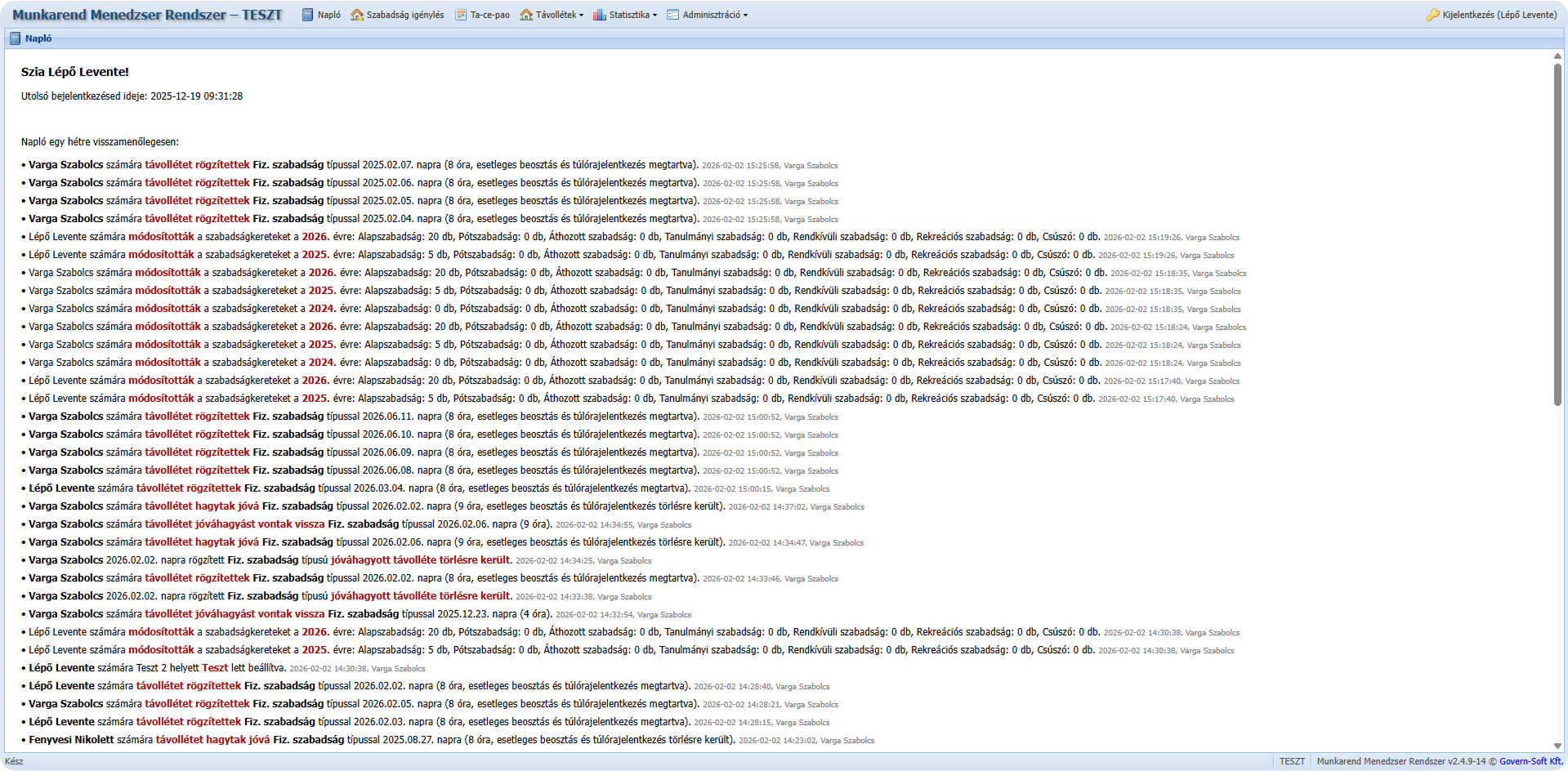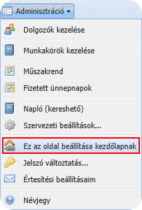 Helyes bejelentkezési adatokat megadva alapértelmezetten a "Napló" felület jelenik meg. Rendszer bármely felülete megadható nyitólapként a kívánt felületet megnyitva, majd az "Adminsztráció" menüpont alatt az "Ez az oldal beállítása kezdőlapnak" funkciót kiválasztva.