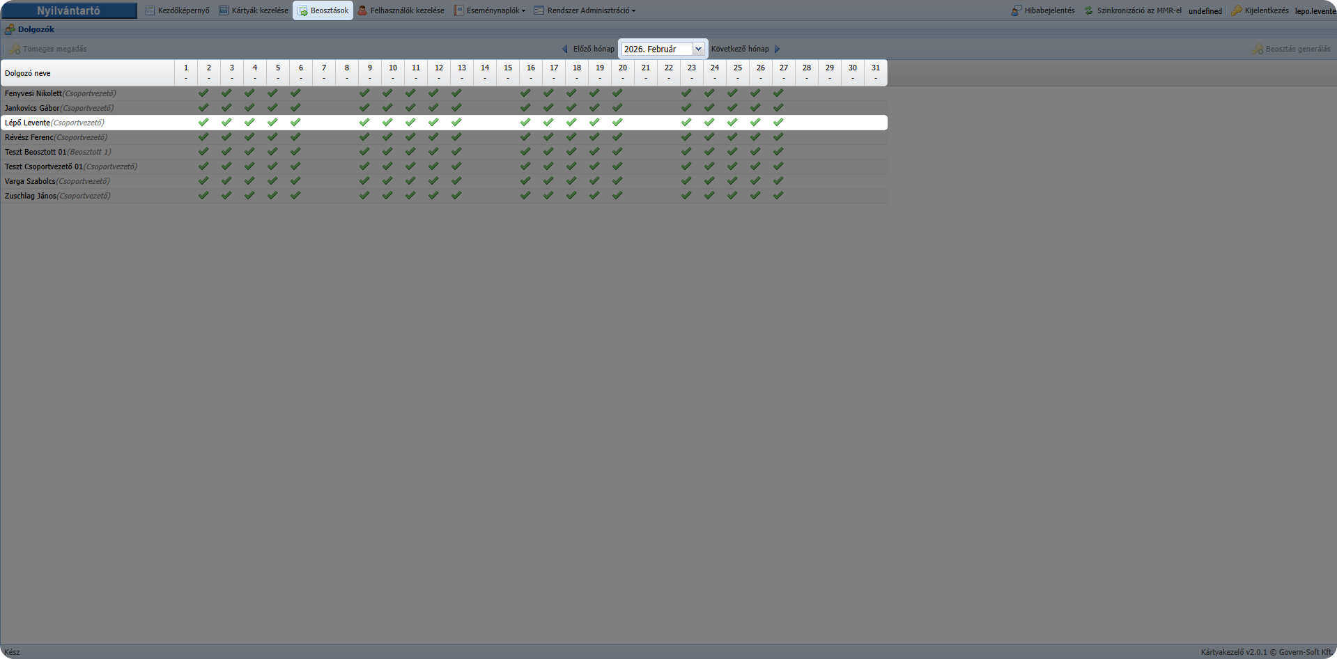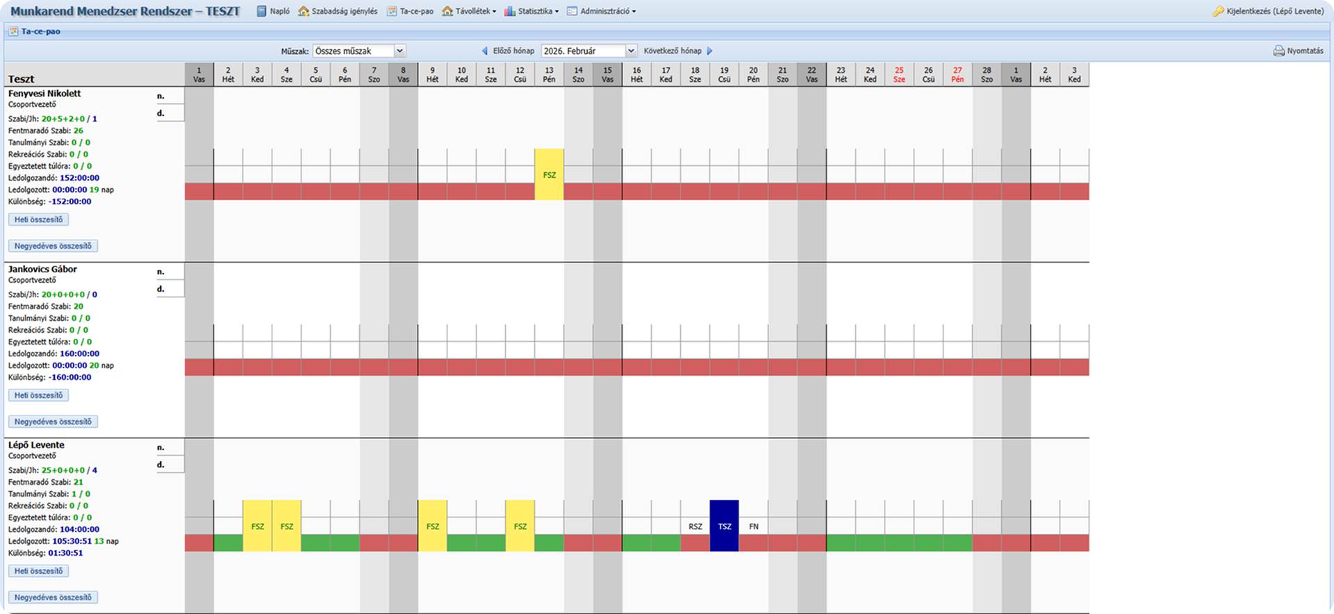 A Tacepao az MMR rendszer havi nézetű áttekintő felülete, amely dolgozónként jeleníti meg: