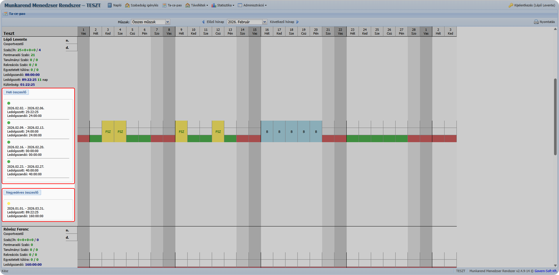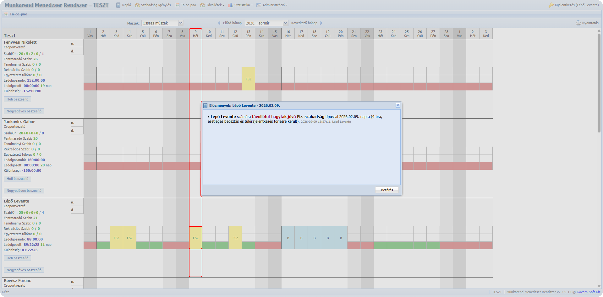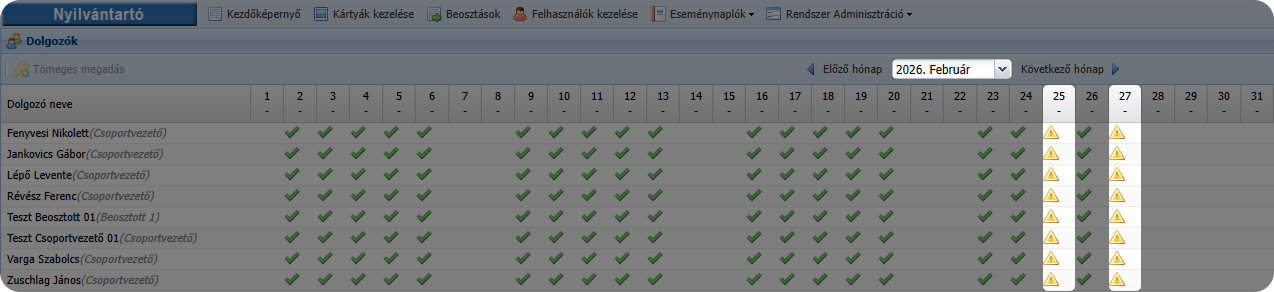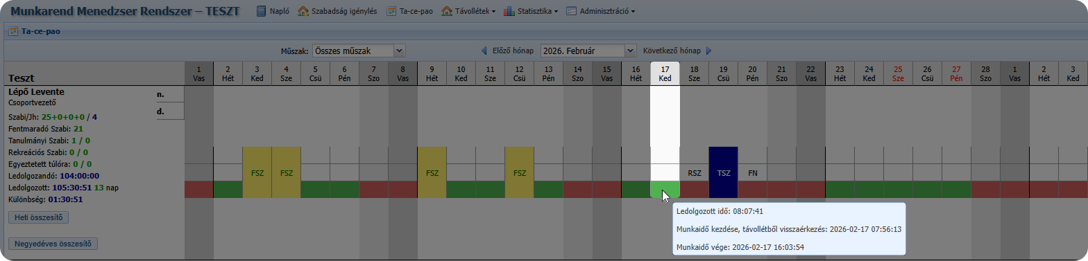 A felület célja a dolgozók havi munkarendjének és napi eseményeinek egységes megjelenítése.