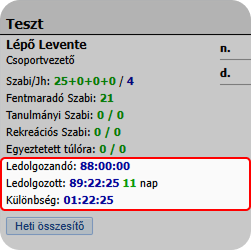 Amennyiben a ledolgozott órák száma meghaladja a ledolgozandót, pozitív előjelű érték jelenik meg.