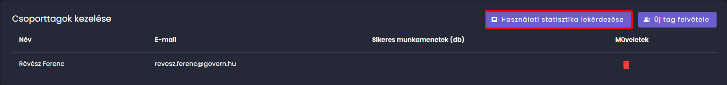 A csoport tulajdonosának lehetősége van exportálni a csoport tagjai által indított munkamenetek listáját megadott időszakra vonatkozóan. A kiexportált Excel fájl az alábbi adatokat tartalmazza munkamenetenként: