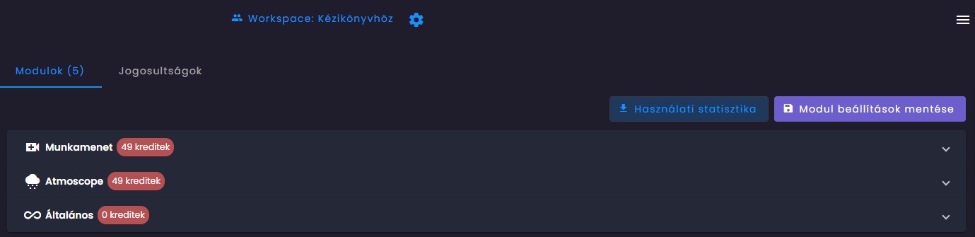 A felületen minden aktív modul mellett megjelenik az elérhető kreditmennyiség is. Ha a kredit keret egy közös csomagként került megvásárlásra, amelyet minden, a workspace-hez tartozó modul közösen használ, akkor az elérhető kreditek száma az "Általános" csoport mellett fog megjelenni.