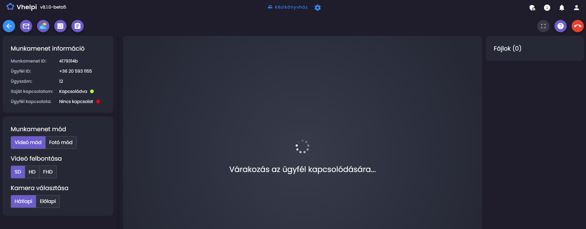 gomb megnyomása után a rendszer létrehozza a munkafolyamatot, elküldi a meghívót az ügyfélnek, majd átirányítja az operátort egy másik felületre, ahol várakoznia kell az ügyfél csatlakozásáig.