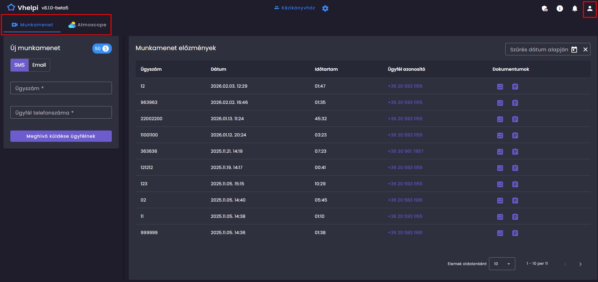 Bal oldalon: új munkamenet indítása SMS vagy Email meghívóval, valamint az ügyfélszám és telefonszám megadása.