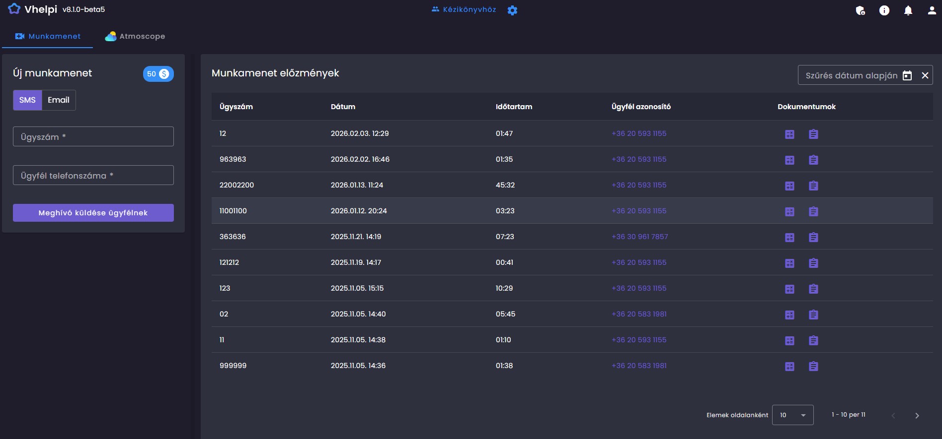 Középen: a munkamenet előzmények listája, ahol dátum, időtartam, ügyszám, azonosító és dokumentumok szerint láthatók a korábbi hívások.