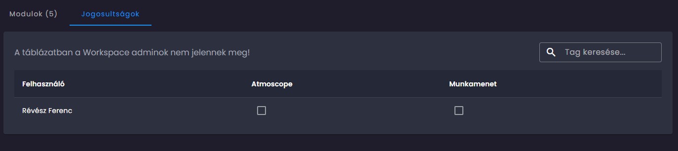 A munkaterület tulajdonosa rendelkezik teljeskörű hozzáféréssel az adott workspace-hez, így ő állíthatja be, hogy melyik felhasználó mely modulhoz férhet hozzá. Emellett admin jogkörrel rendelkező felhasználókat is kijelölhet.