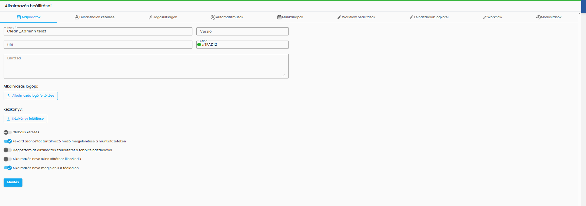 Mivel másolással egy új alkalmazás jön létre, a másolatokon a "Módosítások naplója" nem tartalmaz semmi bejegyzést, míg az alkalmazásban nem történik adminisztrációs tevékenység (felhasználó rögzítés, jogcsoport műveletek, stb.).
