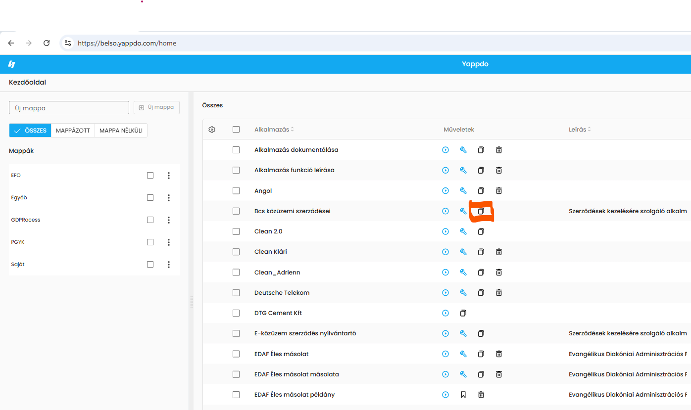 Alkalmazás másolható dashboardon, alkalmazás csempéjén (Dashboard csempés nézet), vagy alkalmazás sorában (Dashboard mappás nézet) található másolás ikonra kattintva.