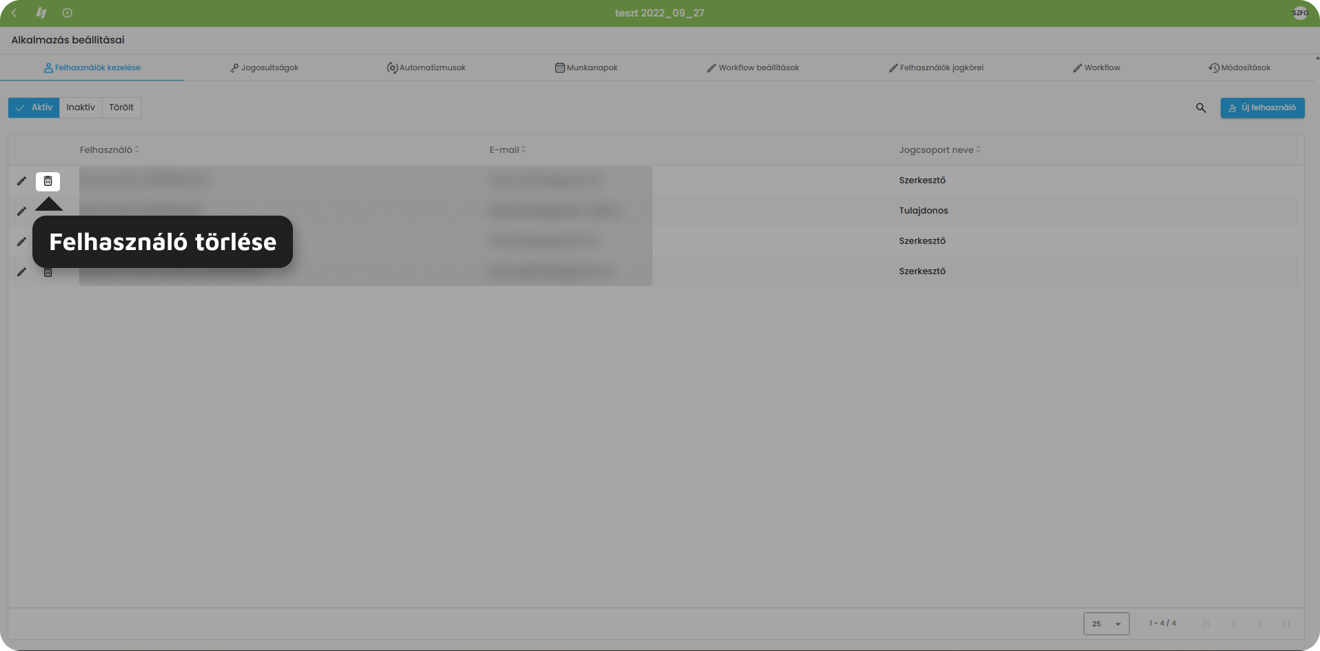 Felhasználót törölni a felhasználó neve melletti kuka ikonra kattintva lehetséges.