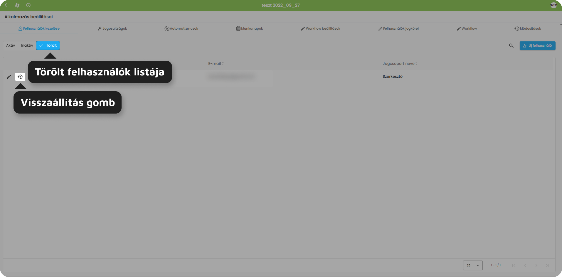 Törölt felhasználók listája a baloldali 3 állású switch "Törölt" értékére váltva jelenik meg.