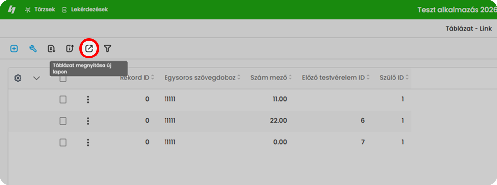 | Szülő rekord megnyitása | Rekord fejlécén megjelenik az ikon, arra kattintva megnyitja az adott rekord szülőjét. |
