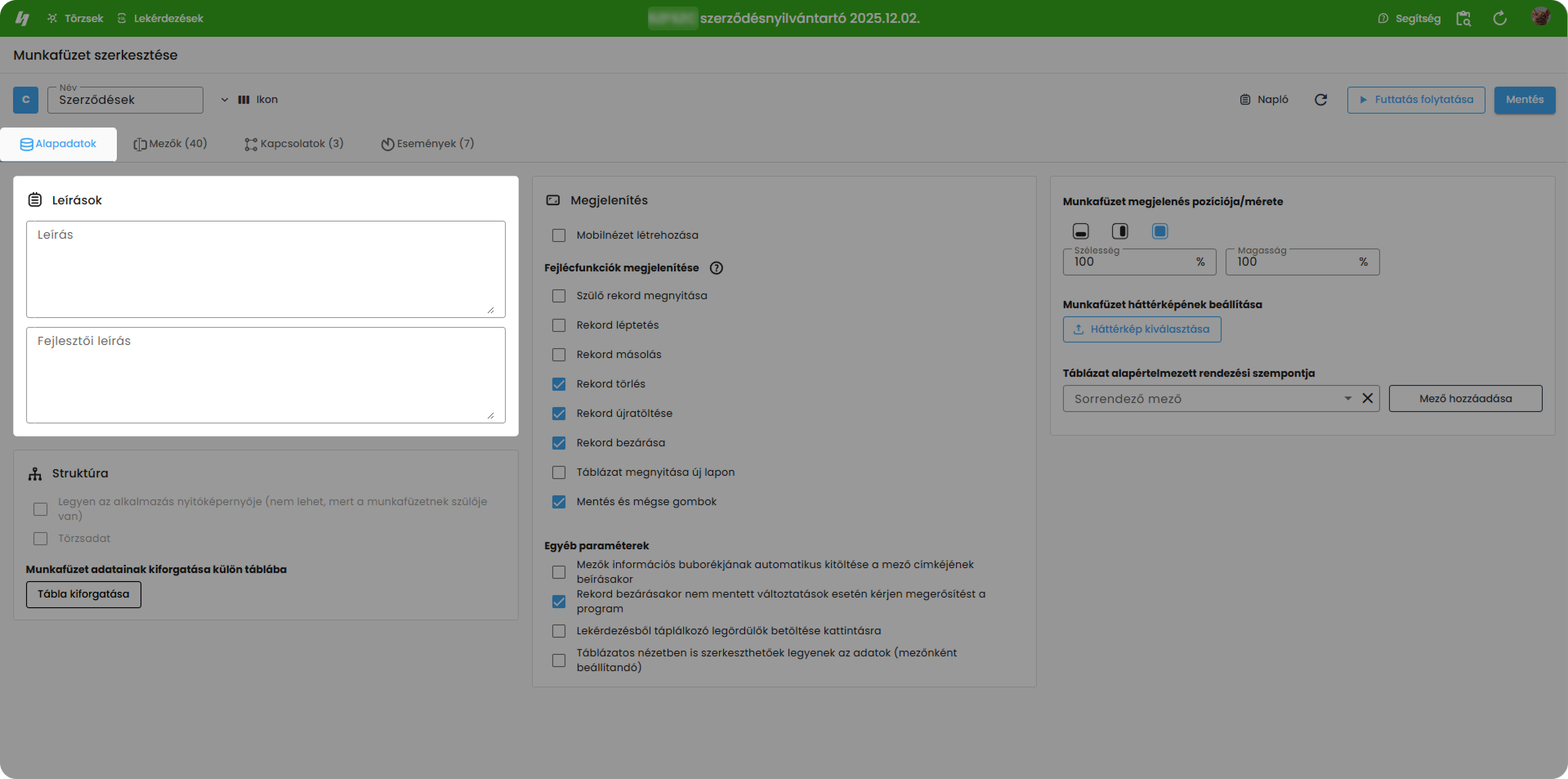 | Fejlesztői leírás | Fejlesztőknek szánt leírás a munkafüzetről. Milyen speciális funkciók, folyamatok, események, logikák találhatók a lapon. |