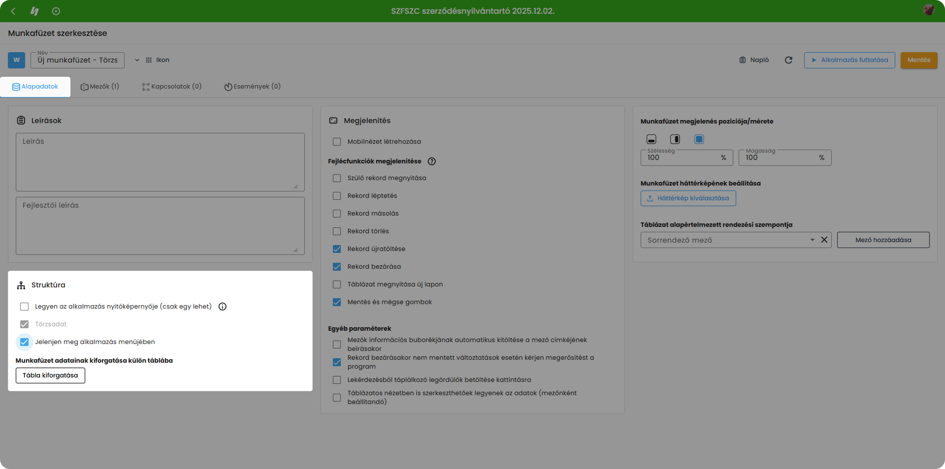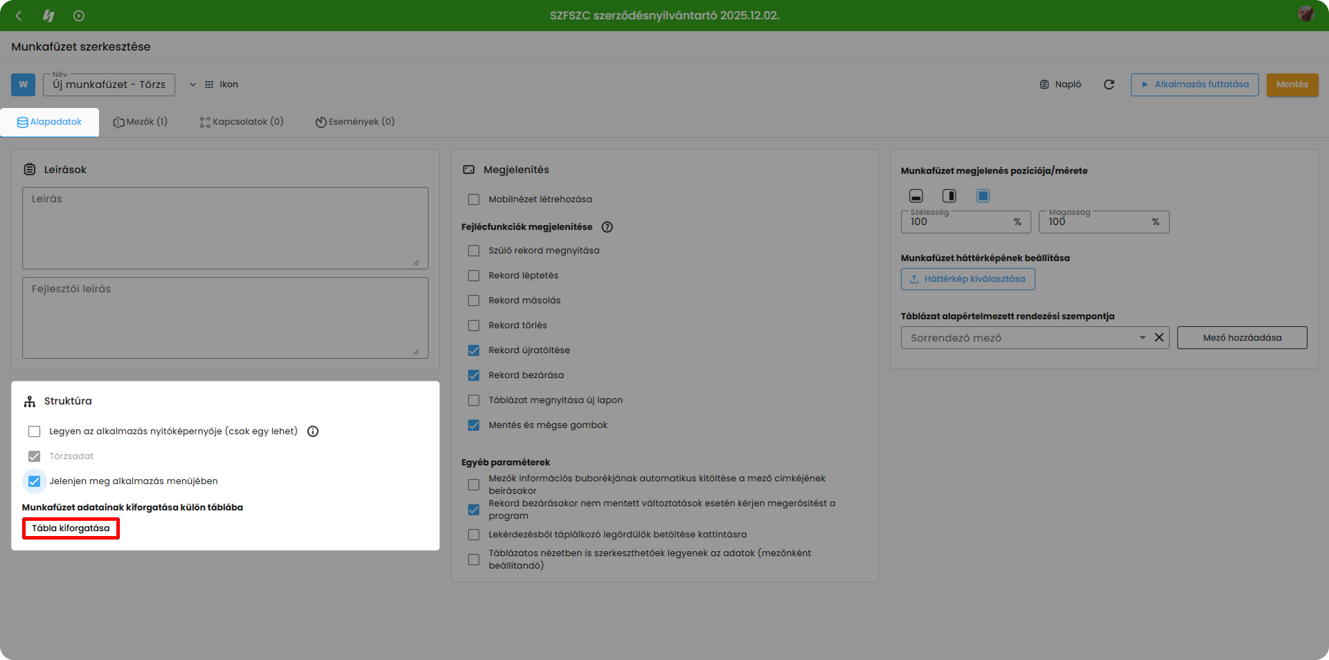 | Munkafüzet adatainak kiforgatása külön táblába | Munkafüzethez külön az alap jSon-ös adattárolástól független tábla jön létre melybe a már létrehozott rekordok megjelennek, illetve az új rekordadatok tárolása történik. Az adatok elérése ilyen módon gyorsabbá válik. |