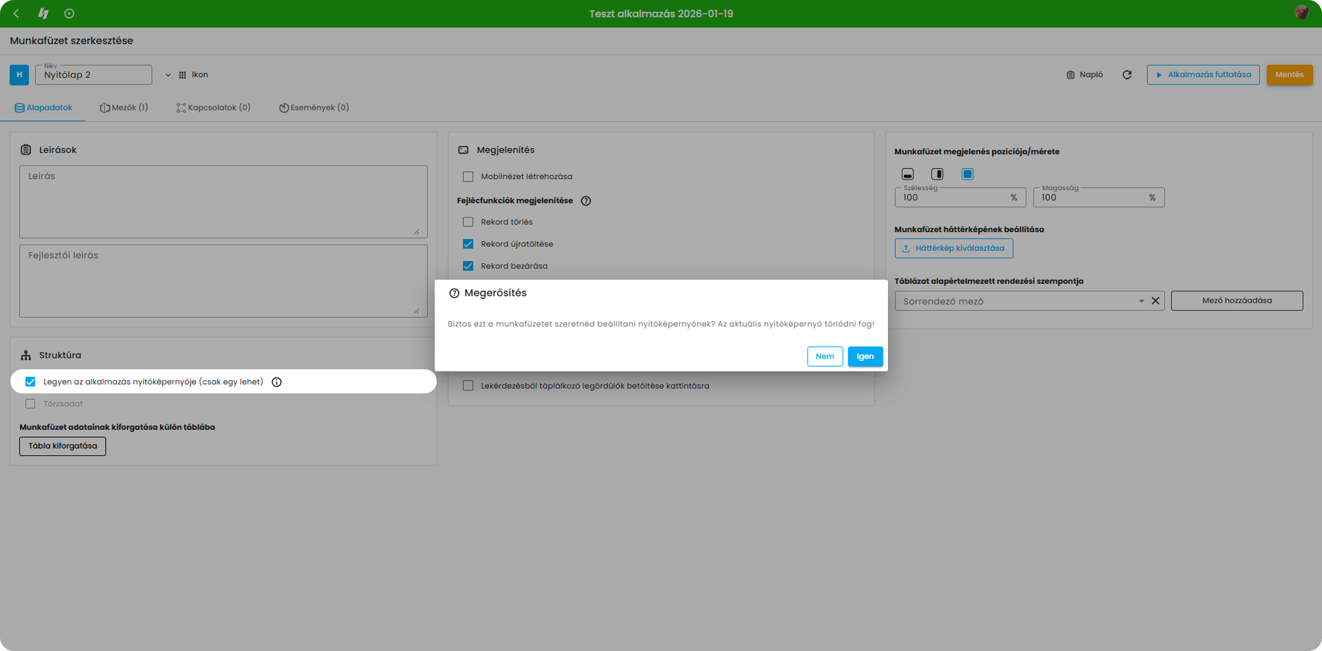 | Legyen az alkalmazás nyitóképernyője (nem lehet, mert a munkafüzetnek szülője van) | Amennyiben munkafüzetnek nincs szülője - azaz nincs almunkafüzetként kapcsolva egy másik lapra - paraméterezhető, hogy az alkalmazás nyitóképernyője legyen. Munkafüzet létrehozásakor ezt a paramétert beállítva az alkalmazás nyitóképernyője lesz. Nyitó képernyőként beállított munkafüzete szerkesztve a checkbox kitöltött állapotú. |