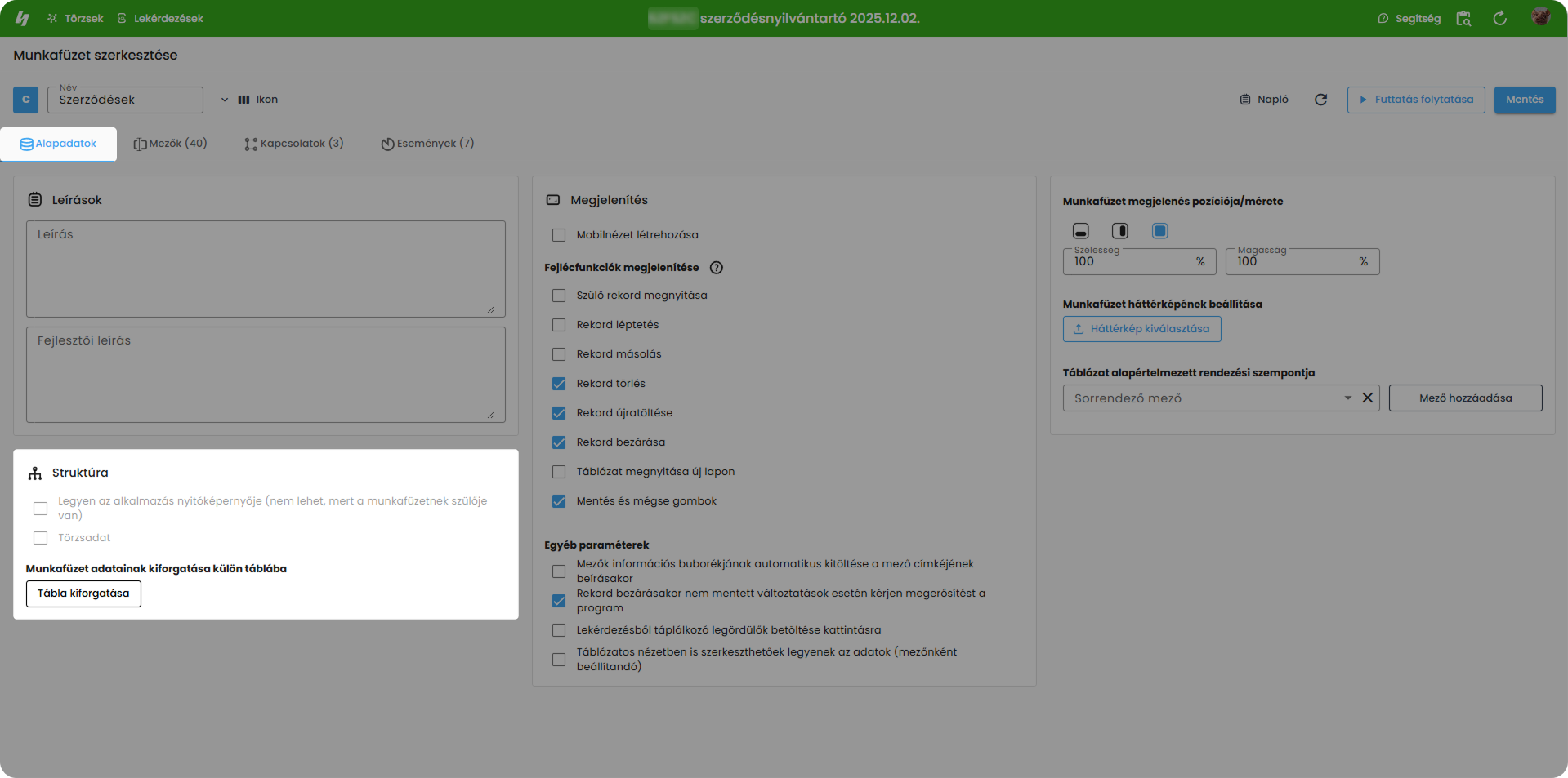 | Munkafüzet adatainak kiforgatása külön táblába | Munkafüzethez külön az alap jSon-ös adattárolástól független tábla jön létre melybe már létrehozott rekordok megjelennek, illetve az új rekordadatok tárolása történik. Az adatok elérése ilyen módon gyorsabbá válik. |